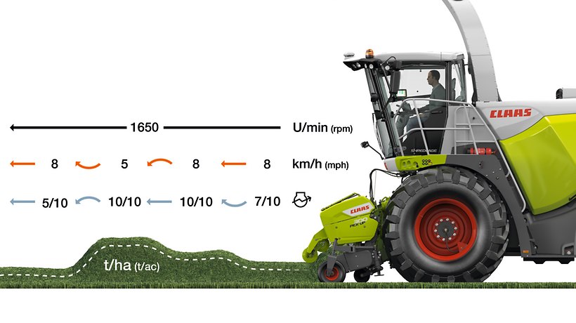 Sie realisieren mit CEMOS eine noch effizientere Ernte – bis zu 7% mehr ha/h bei 12% Kraftstoffeinsparung sind möglich. Um die Effizienz zu steigern und den Verbrauch zu senken, hält der JAGUAR die eingestellte Drehzahl konstant und regelt Motorleistung und Fahrgeschwindigkeit entsprechend der Erntemasse. Bei zunehmender Erntemasse wird zum Beispiel die Fahrgeschwindigkeit zurückgenommen. Bei geringerer Erntemasse reduziert sich die Motorleistung automatisch.